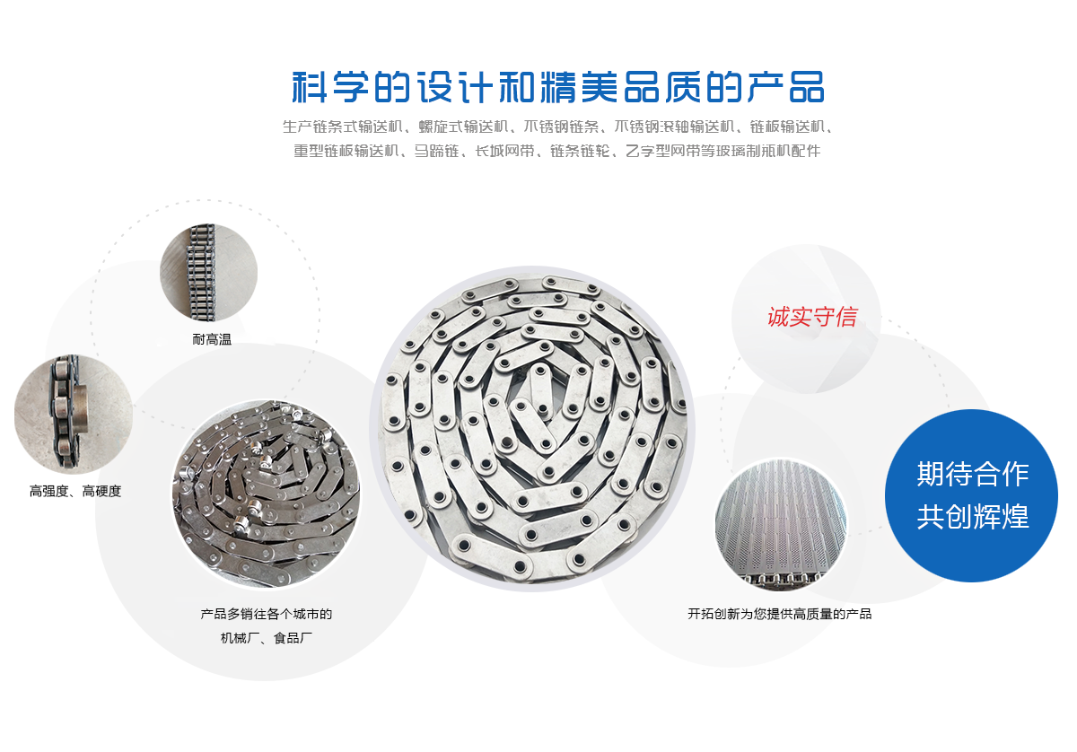 生產(chǎn)鏈條式輸送機、螺旋式輸送機、不銹鋼鏈條、不銹鋼滾軸輸送機、鏈板輸送機、重型鏈板輸送機、馬蹄鏈、長城網(wǎng)帶、鏈條鏈輪、乙字型網(wǎng)帶等玻璃制瓶機配件,食品機械配件及各種網(wǎng)帶的專業(yè)廠家 ,多年來產(chǎn)品暢銷各地玻璃廠和食品廠,在玻璃制品等行業(yè)中享有較高的聲譽。公司集摸具開發(fā)、機械設計生產(chǎn),銷售于一體的生產(chǎn)型企業(yè)。生產(chǎn)的自動化流水線金屬傳動網(wǎng)帶、鏈條等產(chǎn)品廣泛用于玻璃機械、食品機械、化纖機械、醫(yī)藥、電子、烘干機械、輪胎機械等行業(yè)。產(chǎn)品多銷往各個城市的機械廠、食品廠和一些涉及流水線或自動化設備的公司。